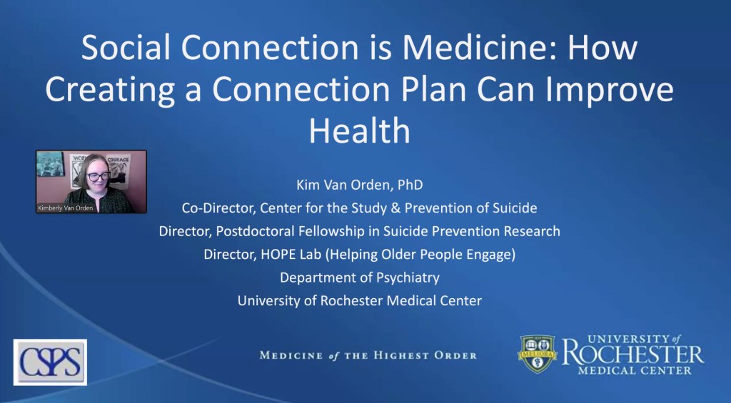 Most people think of medicine as a pill “we might take in the morning or the evening to promote our health,” said Kim Van Orden, an associate professor of psychiatry at the University of Rochester Medical Center.